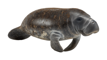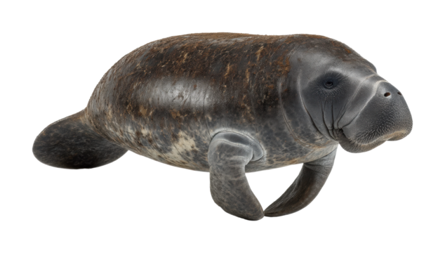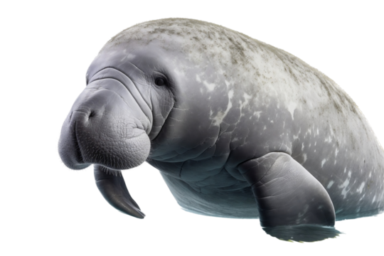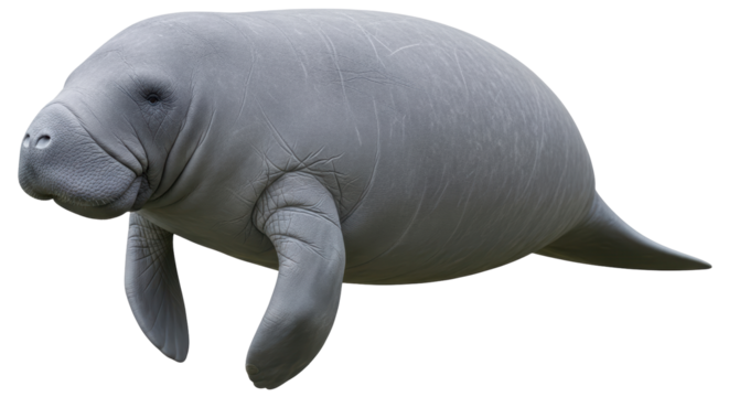 Flat Style Light Blue Smiling Manatee with Paddle Tail, Stubby Flippers, and Subtle Shading on White Background