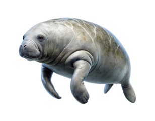 Collection of cartoon manatees in various poses against a white background; a fun illustration.