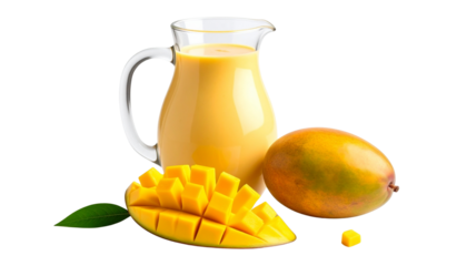 Chilled Mango Shake Served in Jug with Fresh Mango Slice on White Background