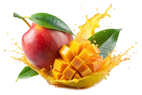Ripe mango fruit and a slice isolated on transparent background, showcasing its vibrant colors and juicy texture