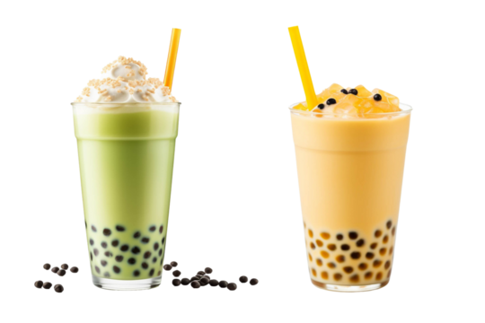 Delicious bubble tea drinks featuring green and orange flavors with tapioca pearls and whipped cream toppings.