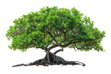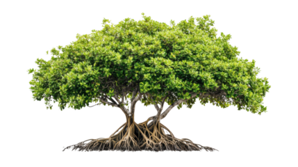 Lush green mangrove tree with exposed roots isolated on transparent background