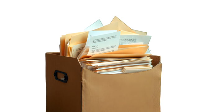 A cardboard box filled with manila folders and loose papers against a black studio backdrop setting scene
