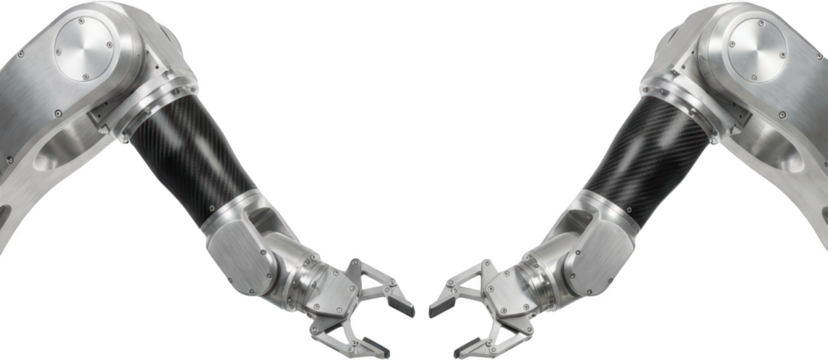 Two sleek dark metallic robotic manipulators, one presenting a glowing sapphire energy key, the other with a glowing finger, on a transparent background, secure digital authorization concept