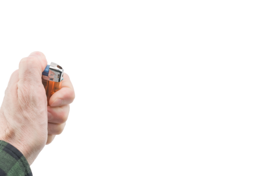 immagine primo piano di mano maschile che regge accendino, accendisigari a gas su sfondo trasparente