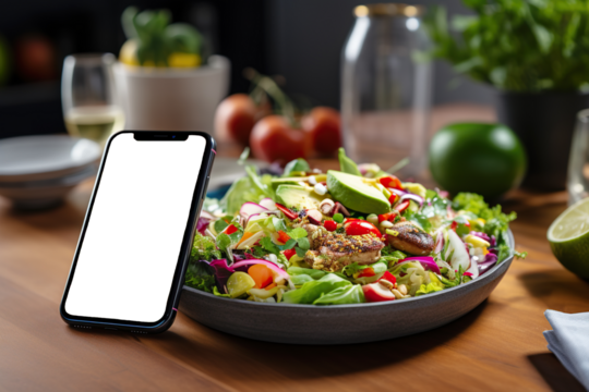 Equilibrio nutricional. Primer plano de plato de ensalada y vegetales con teléfono inteligente con pantalla vacía. Calorías y nutrientes para dieta y alimentación saludable.