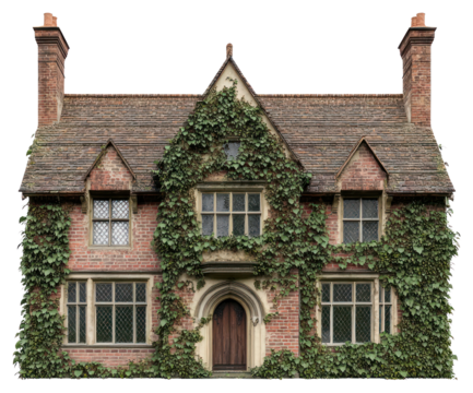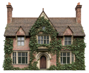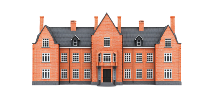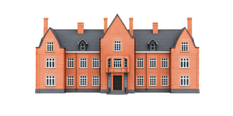Grand Brick Manor: A grand, red brick manor with a stately presence and a symmetrical facade.  The building's intricate details, including the multiple chimneys, gabled roof, and multiple windows.