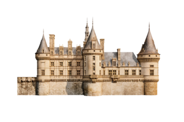 Ancient stone castle with moss covered conical roofs and green ivy climbing its weathered walls and turrets architecture medieval fortress historic ruins europe fantasy old transparent background