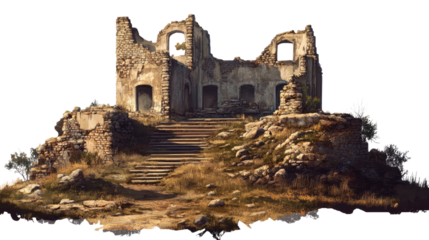 Ruined Manor on a Hillside:  A crumbling manor house sits atop a rocky hillside, its weathered stone walls and broken windows whispering tales of a bygone era.