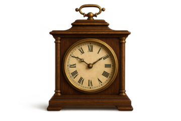 Classic wooden mantel clock with Roman numerals face, isolated on transparent