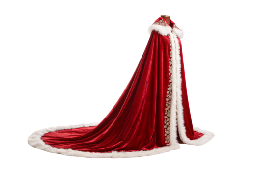 Luxury red velvet cape with white fur trim perfect for santa claus costume or christmas royalty attire on transparent background