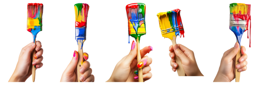 Colorful Paintbrushes in Hands with Dripping Paint and Vibrant Colors, Isolated on Transparent, white background