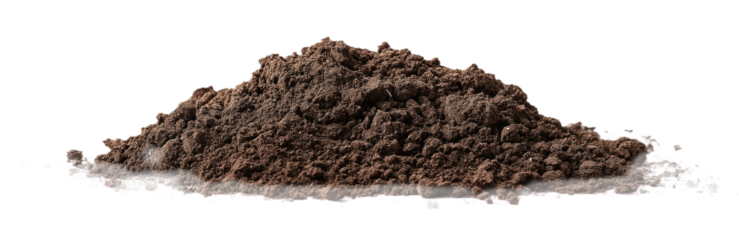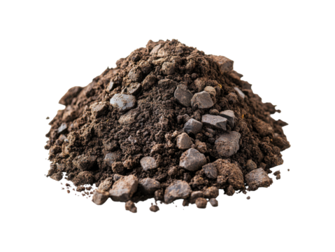 Close-up of pile of soil on isolated transparent background. Rich brown color, densely packed, fertile environment. Soil texture, earthy tones, plain isolated transparent background. Alpha mask.