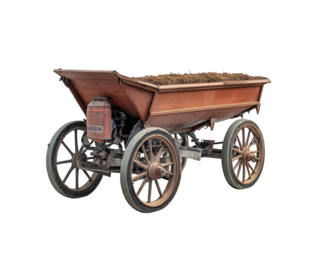 vintage manure spreader with wooden wheels and metal body, showcasing rustic charm and agricultural heritage. Ideal for farming and historical contexts