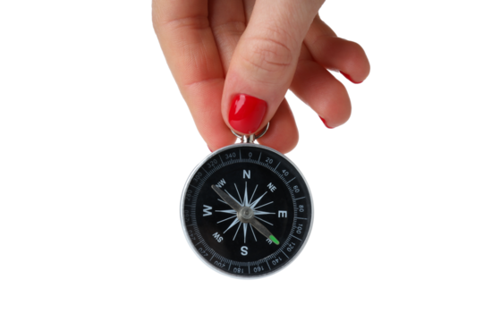 A classic round compass with red, green, and silver needle, cut out - stock png.