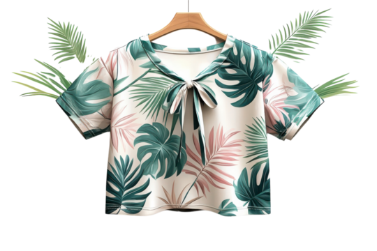 Elegant tropical leaf print blouse with a delicate bow tie detail shown on a hanger against a on transparent background