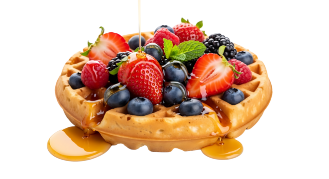 Delicious waffle topped with fresh berries and dripping with syrup a perfect breakfast treat to start the day on a sweet note