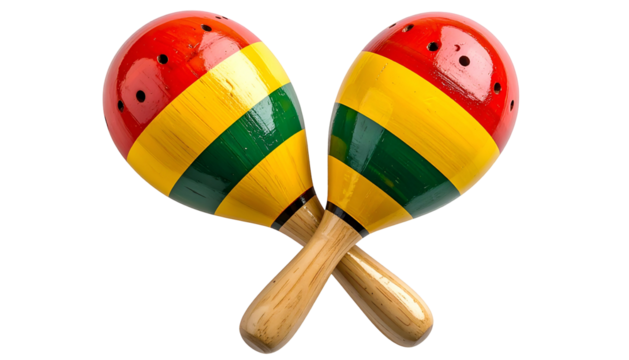 Two brightly colored wooden maracas, crossed with intricate floral and geometric patterns, isolated on a white or transparent background, cutout, PNG