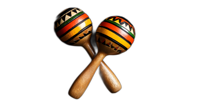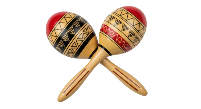 Two brightly colored wooden maracas, crossed with intricate floral and geometric patterns, isolated on a white or transparent background, cutout, PNG