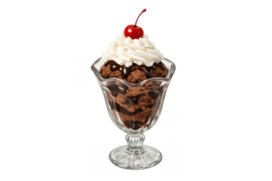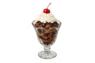 Chocolate ice cream sundae with whipped cream, hot fudge syrup, and a maraschino cherry on top, transparent background