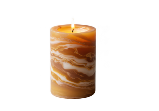 A lit marbled pillar candle with warm brown and white swirls isolated on transparent background