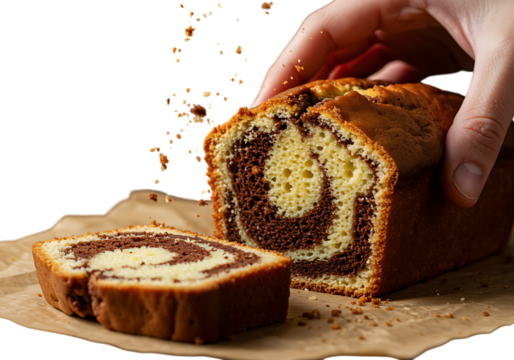 Hand sprinkling crumbs over a marbled loaf cake on transparent background