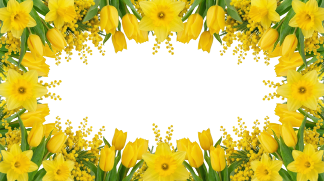 Spring yellow flowers frame isolated png, cutout object, on transparent background template card with copy space. Daffodil flowers, tulips and mimosa . International Women's Day, March 8 , Easter,