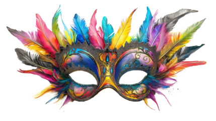 Mardi gras colorful mask with feathers on transparent background for party and carnival