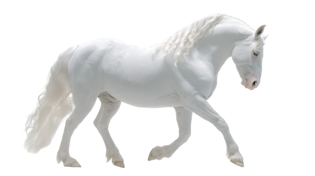 Elegant White Horse Trotting Gracefully on a Transparent Backdrop, Displaying its Agility and Muscular Build