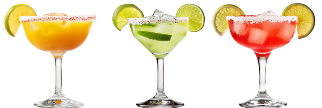 refreshing margaritas with colorful variations isolated on white background