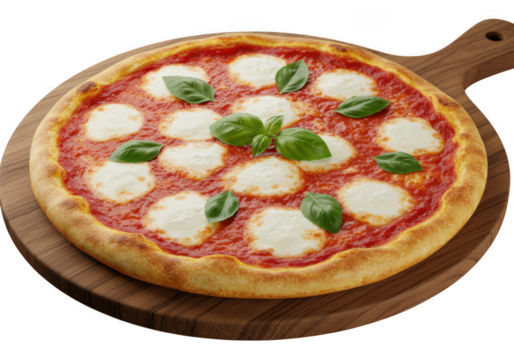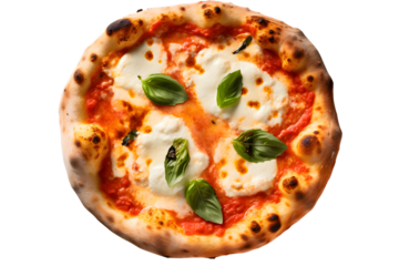 A classic margherita pizza featuring a thin crust, fresh basil leaves, bright tomato sauce, and melted mozzarella, transparent background