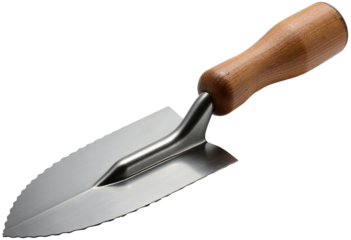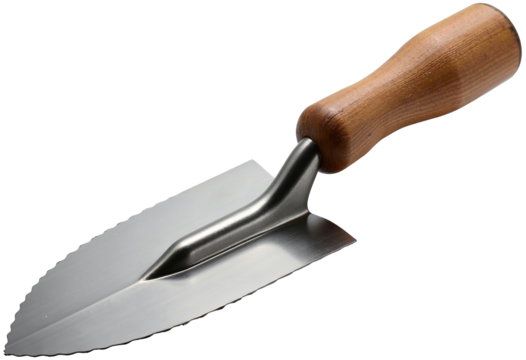 Isolated masonry trowel with polished steel blade and smooth wood handle, shown in side profile on a white background with no shadow and margin included