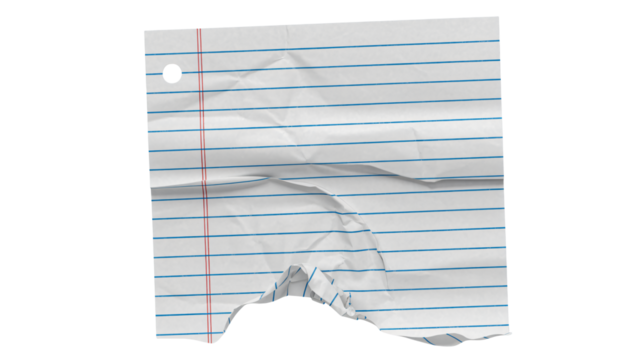 A sheet of lined notebook paper folded into quarters, featuring blue horizontal lines and a red vertical margin line on transparent background.