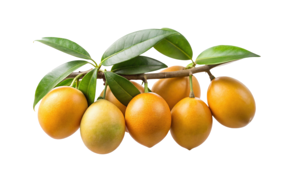 A cluster of ripe golden yellow marian plums with green leaves on a branch isolated on transparent background
