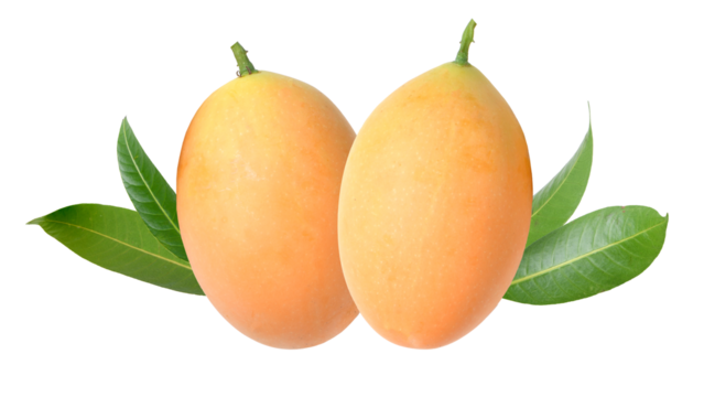 Two ripe yellow marian plum fruits with green leaves isolated on transparent background