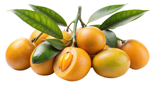 A cluster of ripe marian plums with green leaves showcasing their vibrant orange hue isolated on transparent background