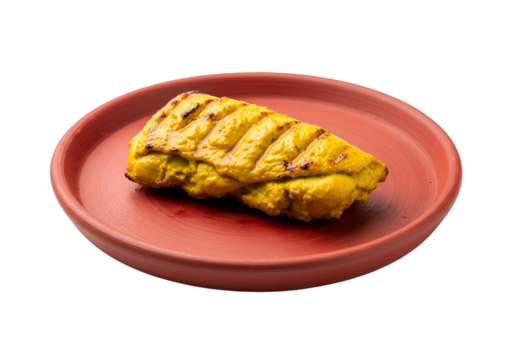 A grilled, spiced chicken breast sits on a terracotta plate, showcasing its golden-yellow marinade and grill marks.
