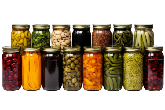 A row of glass jars filled with various pickles and vegetables. The jars are lined up in a row, with some being taller than others. The jars are of different sizes and colors