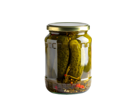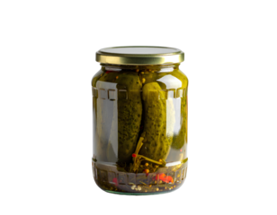 A healthy glass jar of green dill pickles with marinated cucumbers