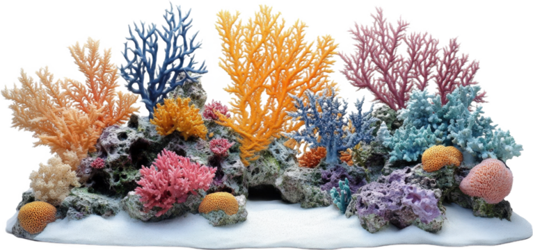 Vibrant artificial coral reef ecosystem with diverse colors isolated on transparent background