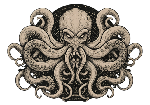 Evil Kraken Illustration In Black And White With Tentacles On Transparent Background