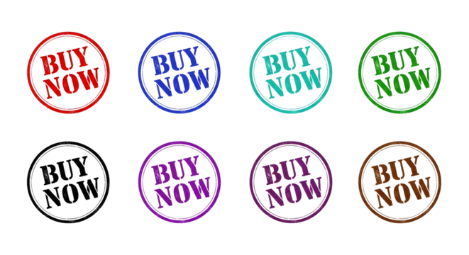Collection of eight grunge buy now rubber stamp icons in various colors on transparent background