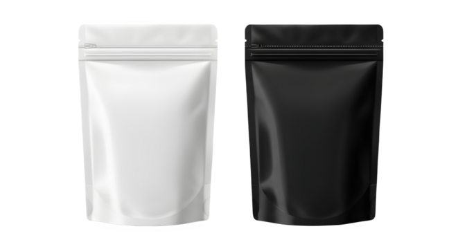 Blank white and black stand up zipper pouches mockup isolated on white background for product packaging.