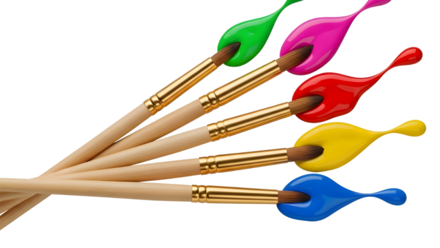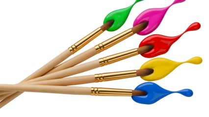 Five Wooden Paint Brushes with Bright Colorful Green, Pink, Red, Yellow, and Blue Paint Splashes