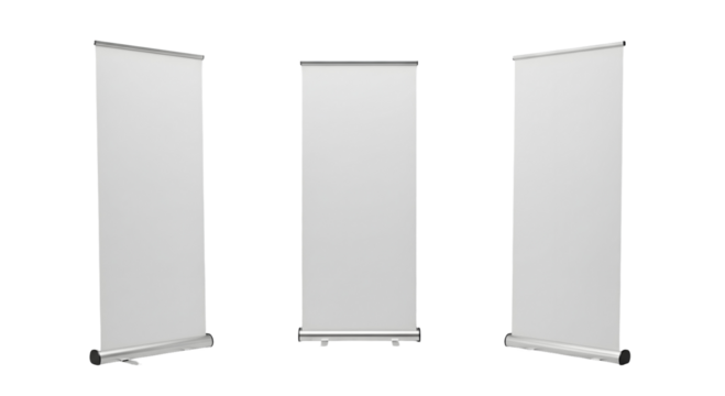 Three blank roll-up banners in different perspectives, ready for your design or message, isolated on transparent background