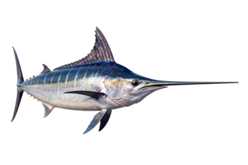Isolated marlin with long bill and fins, swimming in a studio shot presentation angle