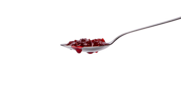 Spoon holding dark red or maroon colored food item or substance with a shiny metal spoon handle visible on the plain white background and png