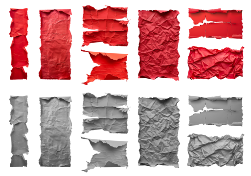 Collection set of red maroon grey gray crushed wrinkle scrunch torn strips pieces paper, old tear crumple rip edges on transparent cutout, PNG. Many different design. Mockup template artwork graphic