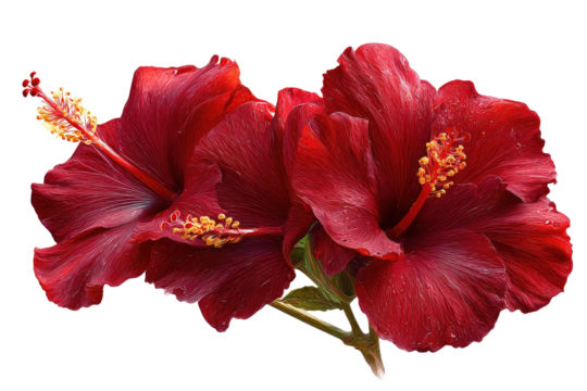 Close-up view of two vibrant, deep-red hibiscus flowers with visible stamens