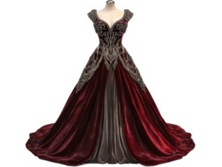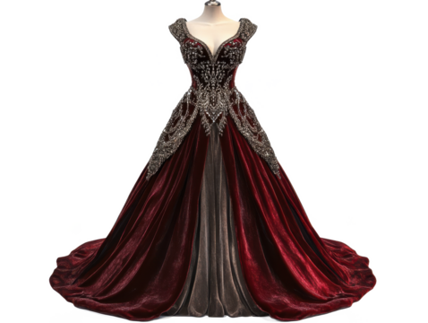 Elegant maroon gown with silver embellishments displayed on a mannequin against Transparent Background